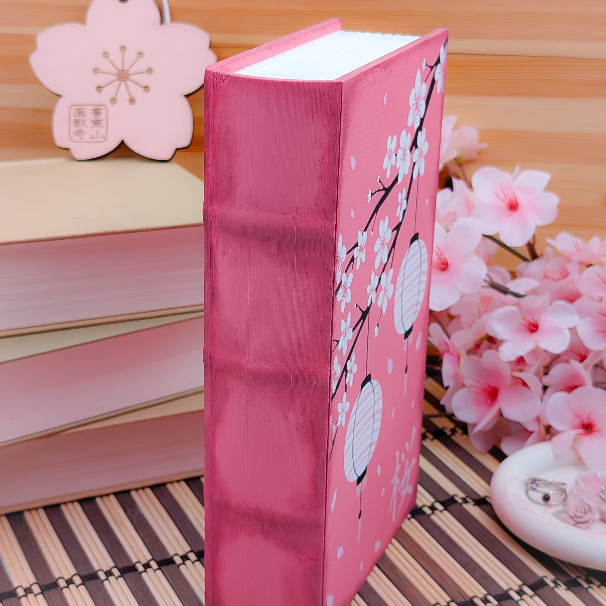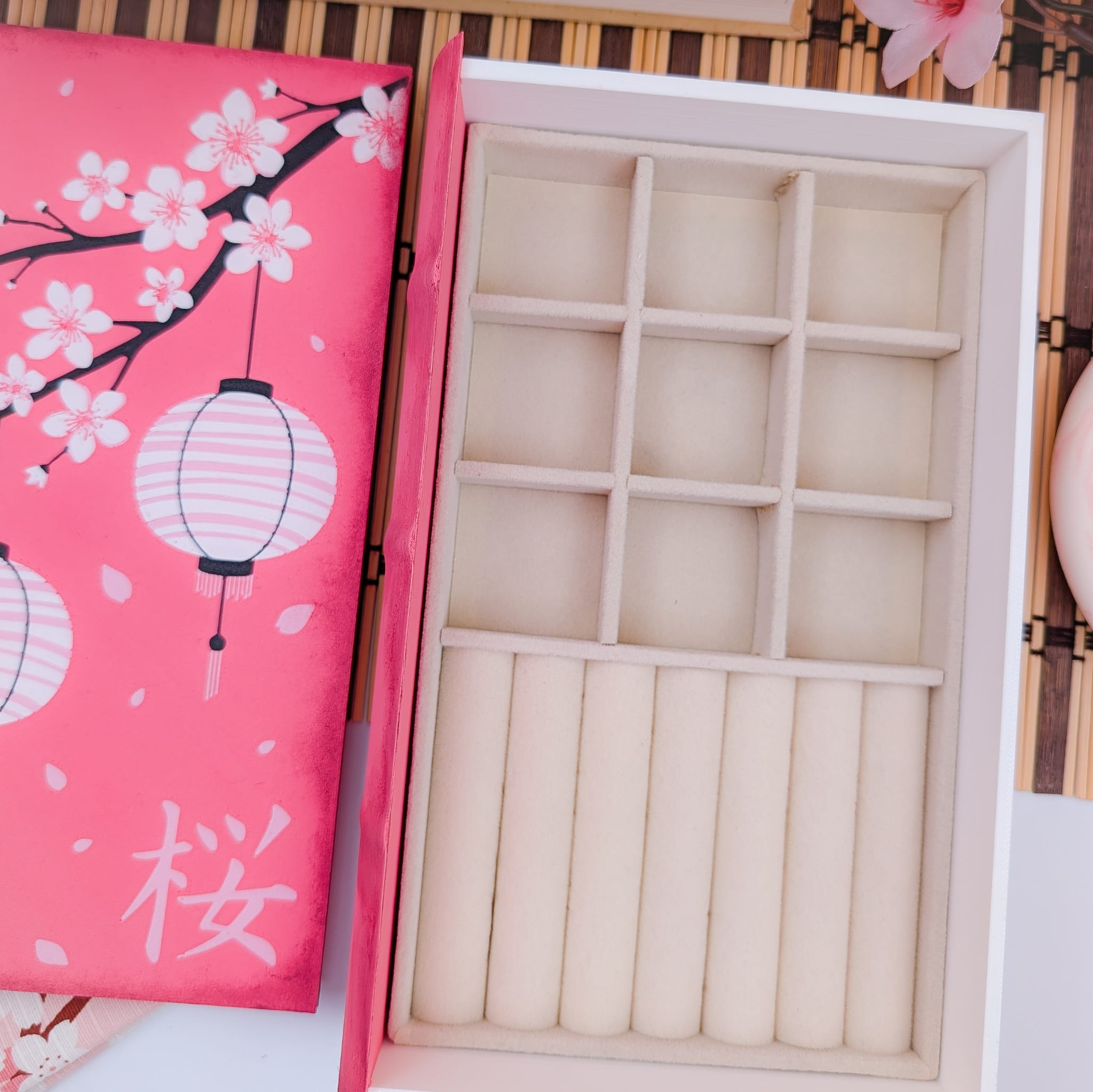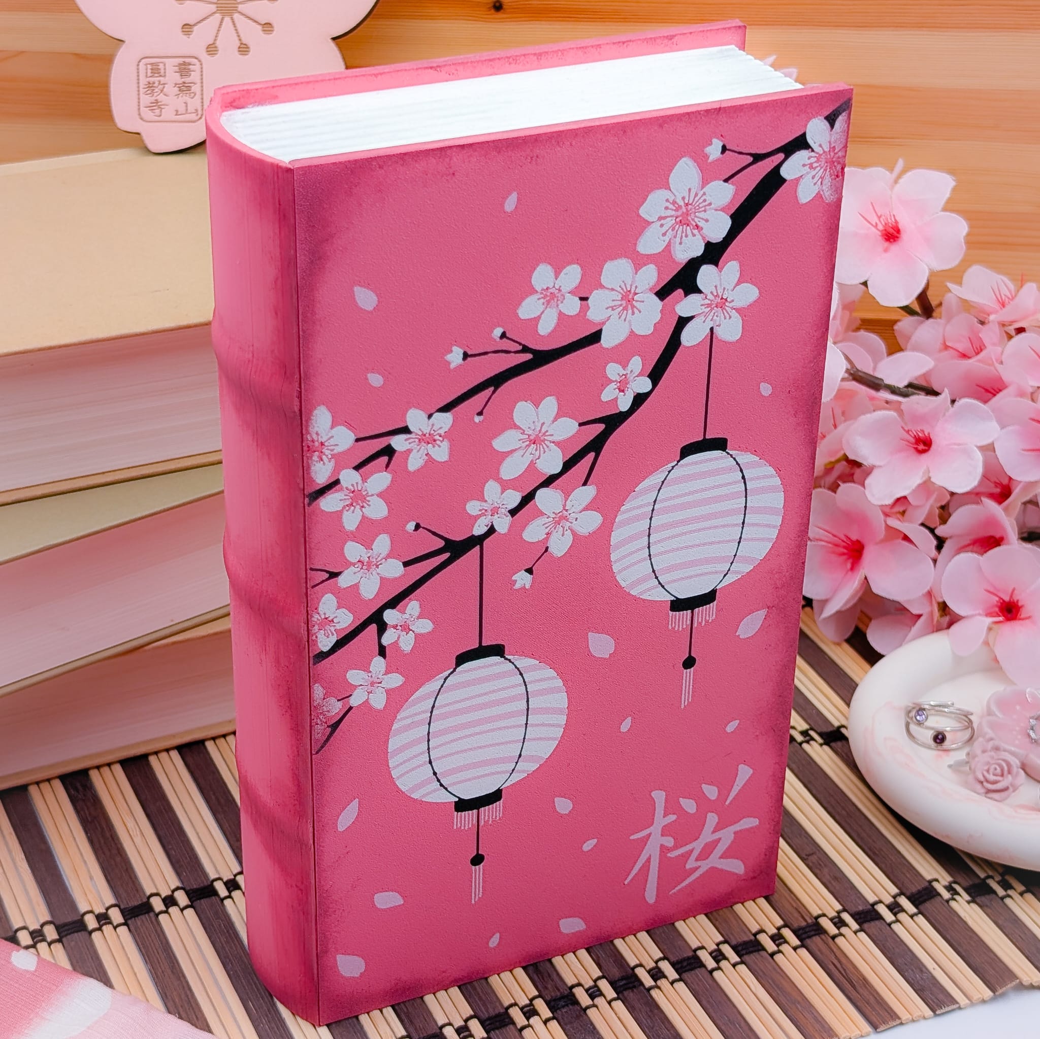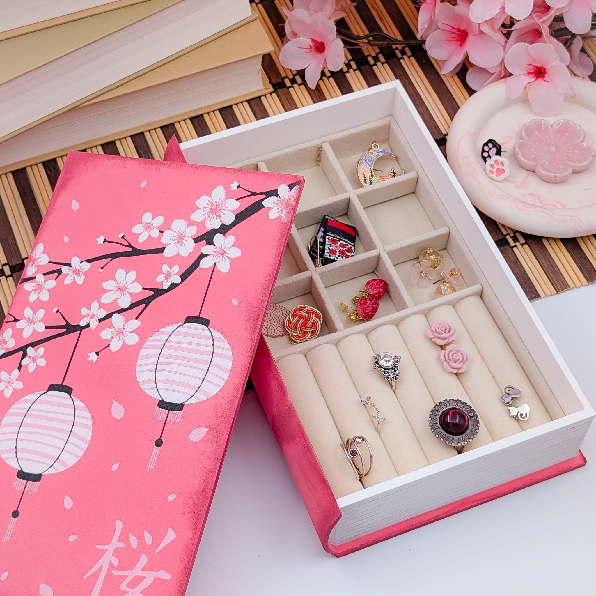 Este joyero con forma de libro está inspirado en la delicadeza de los cerezos en flor, símbolo japonés de la belleza de los instantes fugaces.